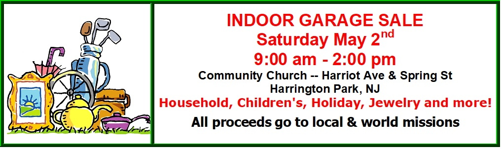2026 INDOOR GARAGE SALE Saturday May 2nd 9:00 am – 2:00 pm Community Church — Harriot Ave & Spring St Harrington Park, NJ