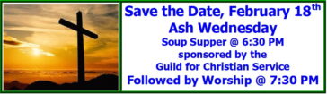 JOIN US FOR THE GUILD’S ANNUAL ASH WEDNESDAY SOUP SUPPER Wednesday, February 18th at 6:30 PM Stay for our first Lenten Worship that begins … Read More